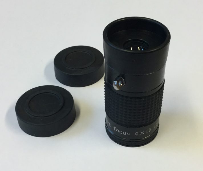 Monokulær kikkert 4×12 for kort fokus fra ca. 40 cm. til det uendelig. Leveres med en myk pose, nakkerem og linseklut.